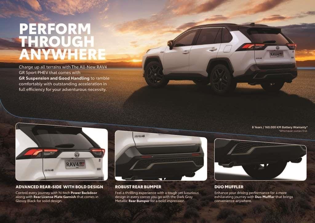 RAV4 GR Sport PHEV dilengkapi dengan teknologi yang canggih berpadu dengan gaya yang sporty, luxury dan elegan, hadirkan Sistem Hybrid yang fleksibel dengan kombinasi mesin dan motor listrik sehingga memberikan kemudahan dan kenyamanan yang membawa Anda berpetualang ‘pergi kemana saja’.